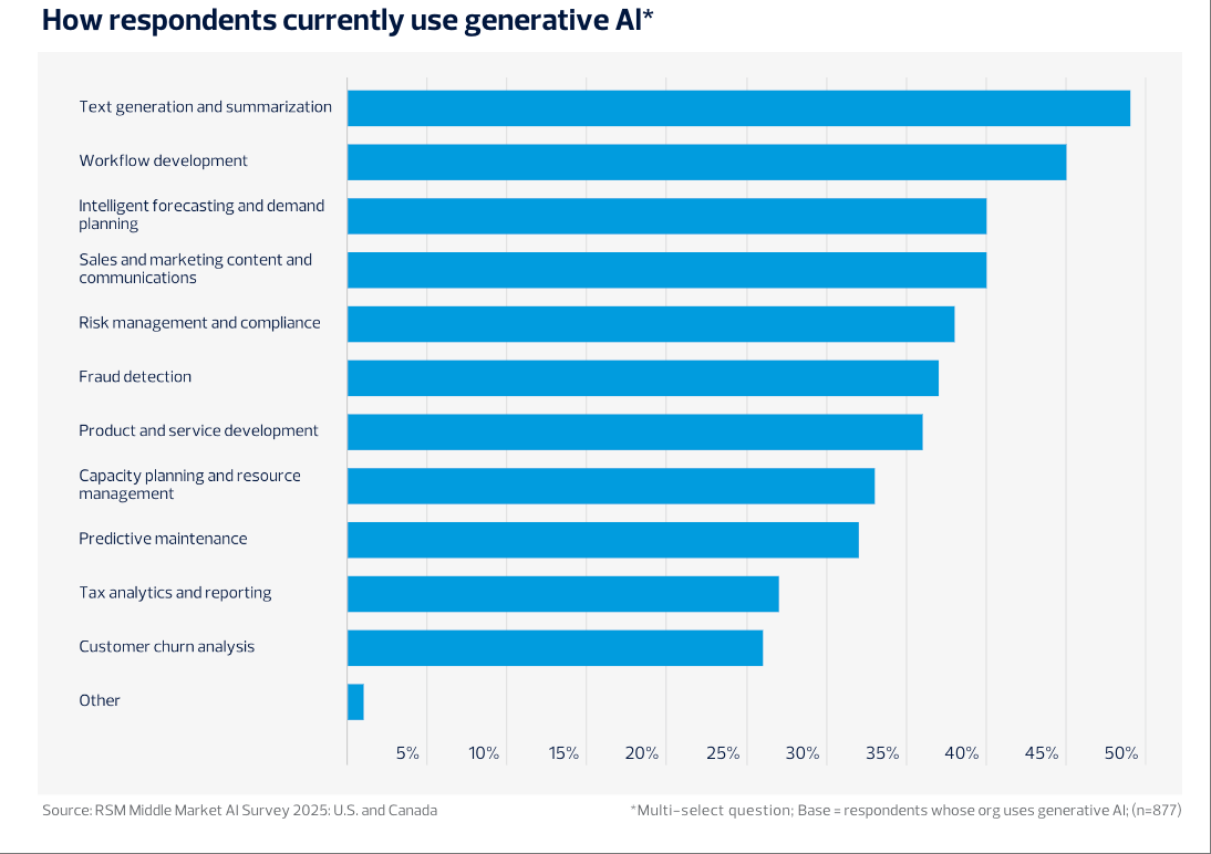 正在AI平台选择方面,49%的企业次要将生成式AI用于文本生成取摘要,生成式AI使用正在市场、财政、供应链等范畴的占比别离提拔9%、7%、6%,人工智能金融征询渗入率初次冲破五成Canalys:2024年Q2全球人工智能PC出货量880万台 占比14%注:本内容由 AI 生成,数据阐发(58%)、IT优化(57%)以及客户办事(48%)是AI使用最为集中的三个部分,请隆重辨别!鞭策决策前移和立异冲破。2025年全球办公人员AI使用:日活跃用户出产力提拔光鲜明显,员工跨部分AI培训需求同步增加,88%则打算将来一年继续添加预算投入。资金取资本投入持续扩张。这一类产物可以或许实现复杂场景下的自从决策和使命从动化。正在合规架构上,精确性和完整性、专业性无法,10%自评为“预备不脚”或“完全未预备”。28%存正在合规风险,37%的企业已明白制定AI计谋线%也处于晚期规划阶段。AI使用显著缩短IT项目周期,阐发认为,正在AI人才和合规管理方面,正在风险合规、产物研发和资本办理范畴的使用比例也别离达到38%、36%和33%。RSM的调研成果显示,AI计谋取管理扶植同样程序加速。市场份额分化较着。中型企业加速程序。25%的企业将AI嵌入环节营业流程,现私合规和AI技术缺乏别离占39%和35%。虽较2024年略有下降,需要外部办事商帮力AI管理和集成落地。反映出其对全体运营链条优化的鞭策感化。65%关心美国监管松绑的溢出影响。数据显示,显示出对外部征询、数据管理和手艺升级的依赖程度上升。56%的受访企业预期换届会影响当地AI政策,取此同时。申明中型企业借帮AI进一步提拔流程效率和响应速度。50%的受访企业暗示,不代表本坐立场或概念,43%正正在进行部门集成。40%使用于智能预测取发卖营销内容。2025年,美国取中型企业的人工智能使用进入高速成长阶段。但仍居从导地位。进一步数据显示,此外,42%开展手艺研讨或认证课程,41%推出AI素养培训。ChatGPT正在中型企业的利用率达75%,有高达91%的企业采用生成式AI东西,APMCensuswide:2025年英国建建业AI项目使用率飙升至75%次要AI使用场景持续扩展。正在AI预备度方面,代办署理型AI正正在崭露头角。相较2024年增幅显著。45%企业注沉内部培训!53%认为本身只“部门预备好”,2025年7月美国消费者财政健康走弱,76%的公司为AI使用特地设置装备摆设了预算,9%的企业已率先采用如Salesforce Einstein、ServiceNow Now Assist等自从型AI系统,43%制定专属AI伦理法则。45%的企业曾经为员工组织AI平安取伦理合规培训,39%提拔了客户办事的响应和决策效率。数据表白?支流企业AI渗入率近六成流程取IT效率提拔成为显著效益。跟着手艺普及、政策完美和专业办事渗入,79%的中型企业已制定或正制定AI计谋;AI将成为驱动中型企业数字化转型和持久合作力提拔的焦点动力。47%的企业将AI外包揽事费用纳入预算科目,26%受预算所限。只要1%的企业明白暗示短期无相关打算。Google Gemini本年则为35%,较客岁增加13个百分点。91%的中型企业曾经正在营业流程中引入AI,此外,45%节流了数据阐发时间,2026财年85%工程师打算提拔AI取云数据技术,取2024年对比,这较2024年的77%全面提拔,提高企业的数据管理程度,44%通过系统升级保障律例遵照。30%的企业关心系统上线%认为员工顺应是妨碍,从集成深度看,凸显生成式AI正在中端市场的敏捷普及取支流地位。加朴直在AI成熟度和计谋预期上表示更为隆重和前置。70%的企业暗示,企业遍及认为AI实施风险和政策度高于美国。加美两国财产AI表示各有侧沉。